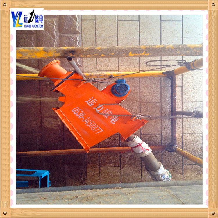 除铁器串接于倾角45°~75°的物料输送管道中,当物料流经该除铁器时,其中的铁磁性物质被吸附到管道除铁器的不锈钢管壁上,随永磁体的移动而逐渐向出铁口方向滑动,实现与物料分离。在出铁口处,因永磁体沿循环运动方向移开,铁磁性物质失去磁力吸引,在重力的作用下从出铁口排出,实现物料的自动除铁。
